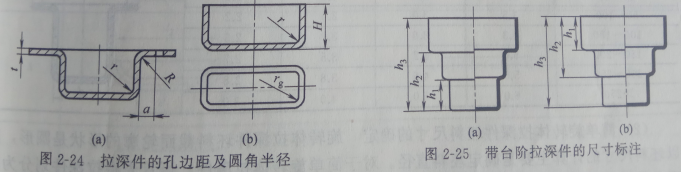4.拉深件的底部或凸緣上有孔時,孔邊到側壁的應滿足α≥R+0.5t(或r+0.5t),如圖2-24(a)所示;